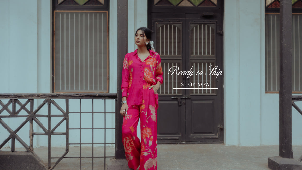 This is a made-to-order style and we will require 15-20 days for production and dispatch. If you require the outfit urgently, please WhatsApp us at +91 93167 53139 before ordering and we will check for you. Please note: We would not be able to accommodate urgent delivery requests made after the order is placed without our prior confirmation and major alterations will be chargeable.