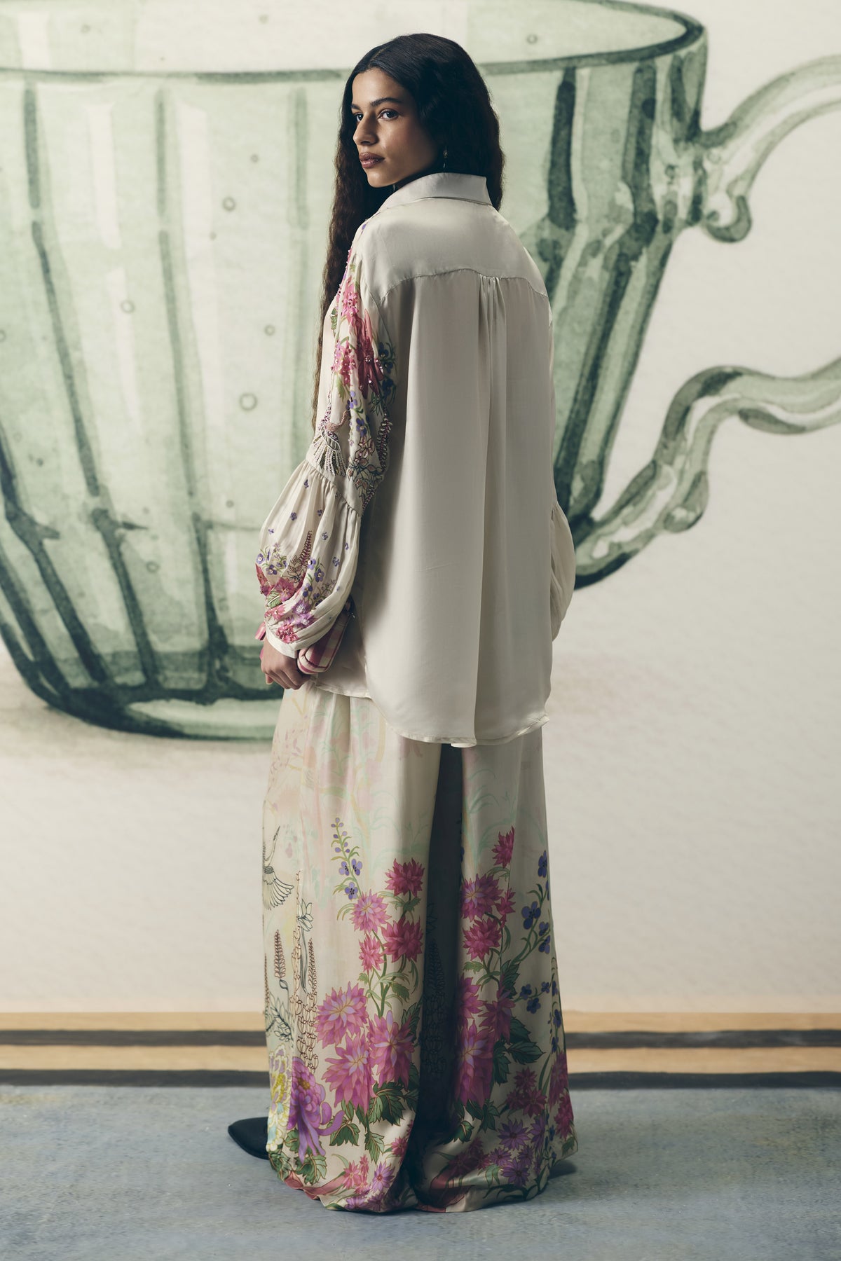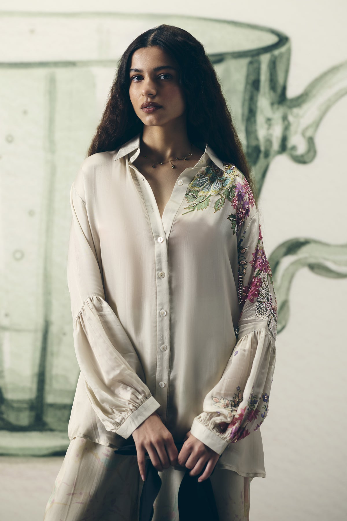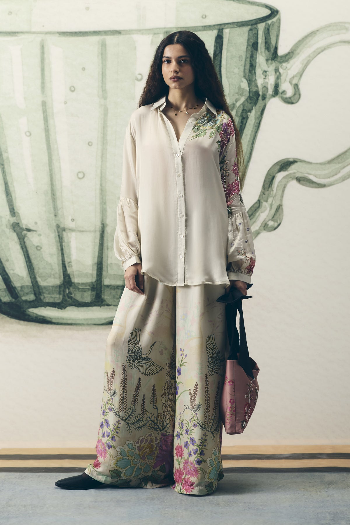 An ivory embroidered co-ord set crafted from pure Japan satin, paired with printed pants, offering a fluid drape and subtle sheen.