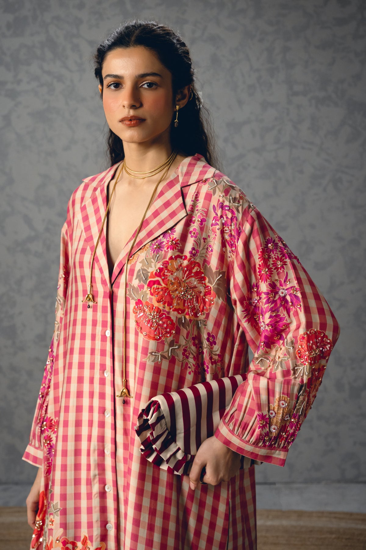 A coordinated pink gingham kurta with a classic collar and pants. Complete the look with a scarf for added comfort and charm.