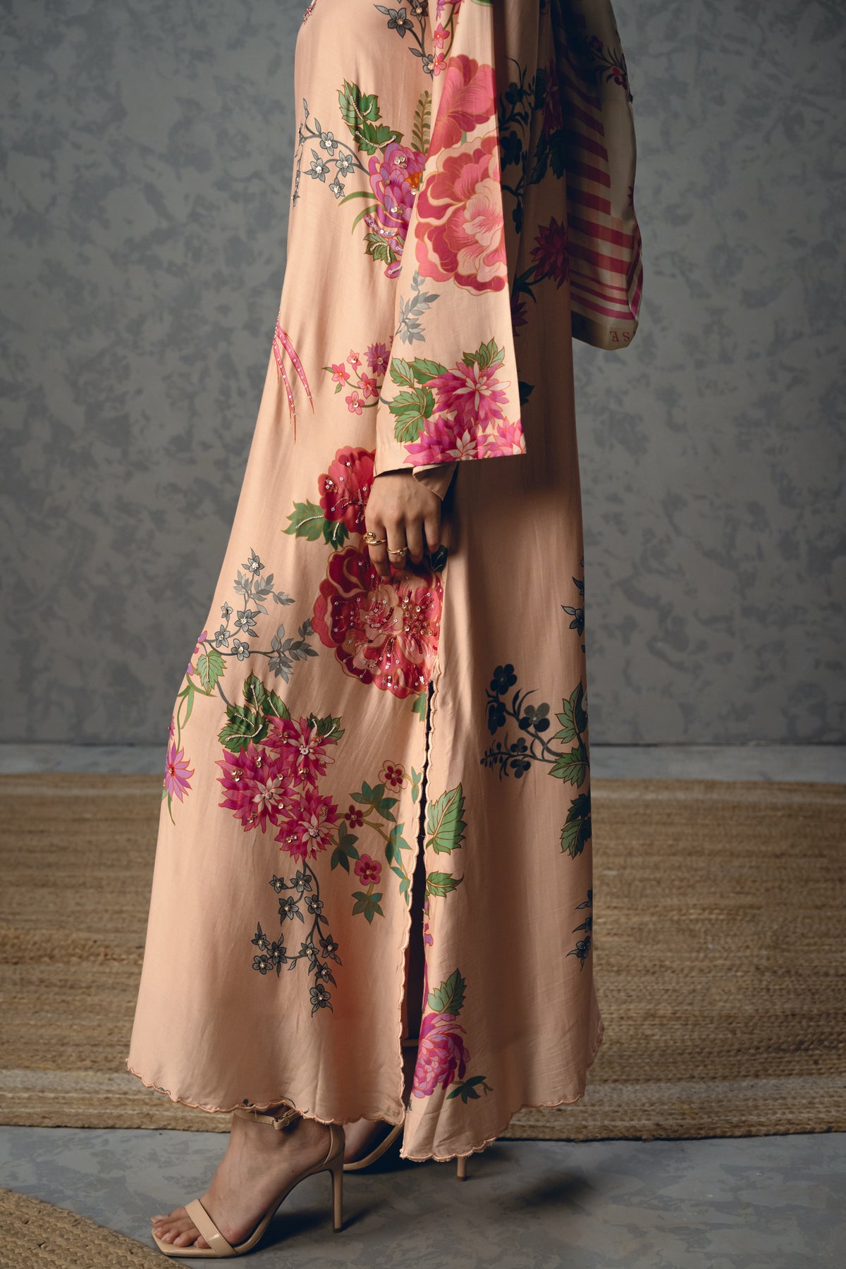 A flowing pink printed kaftaan dress featuring side slits for movement. Light, airy, and beautifully laid-back.