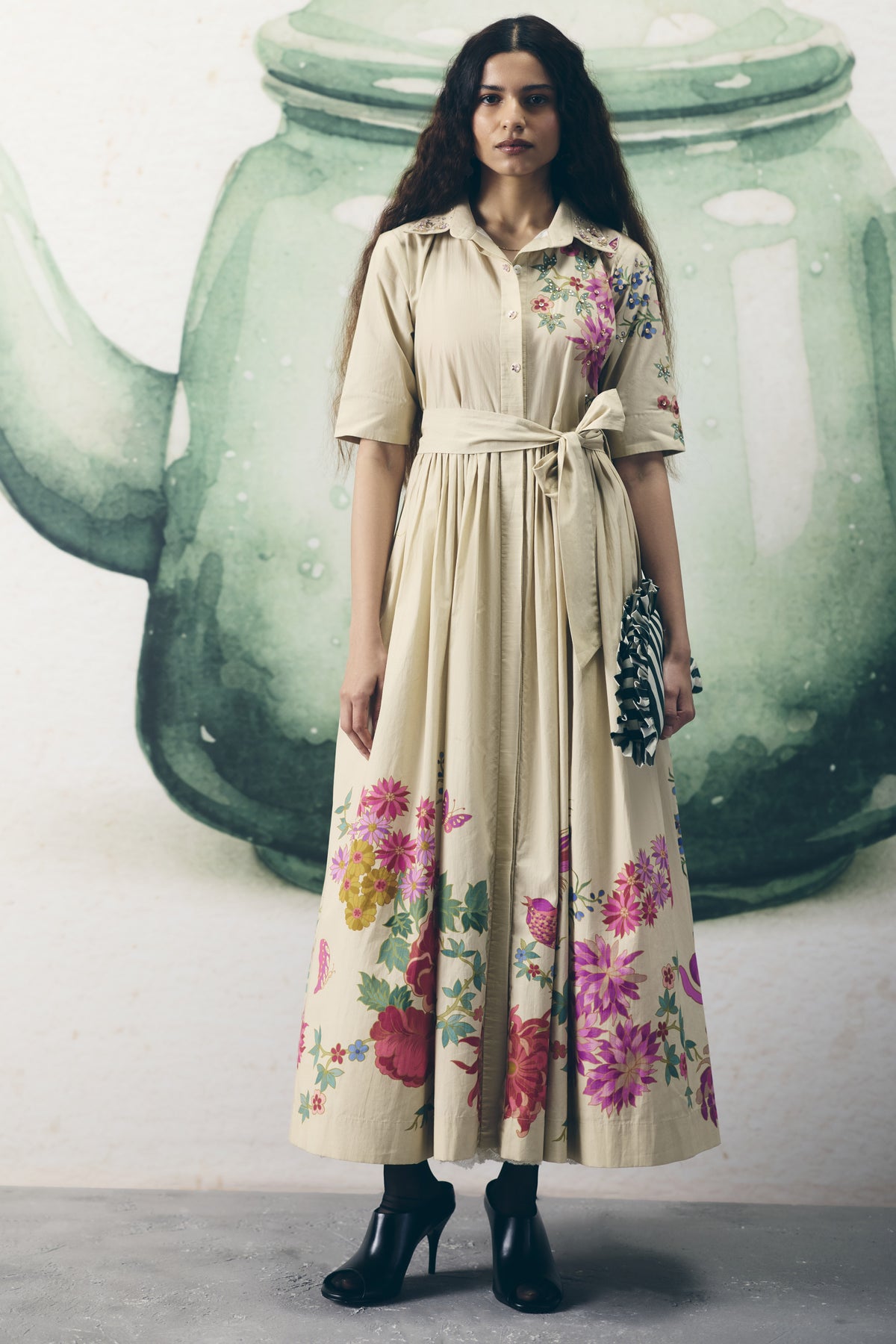 An ivory embroidered dress with a delicate floral placement print. It has a tie-up belt and embroidery at the collar for a touch of sophistication.
