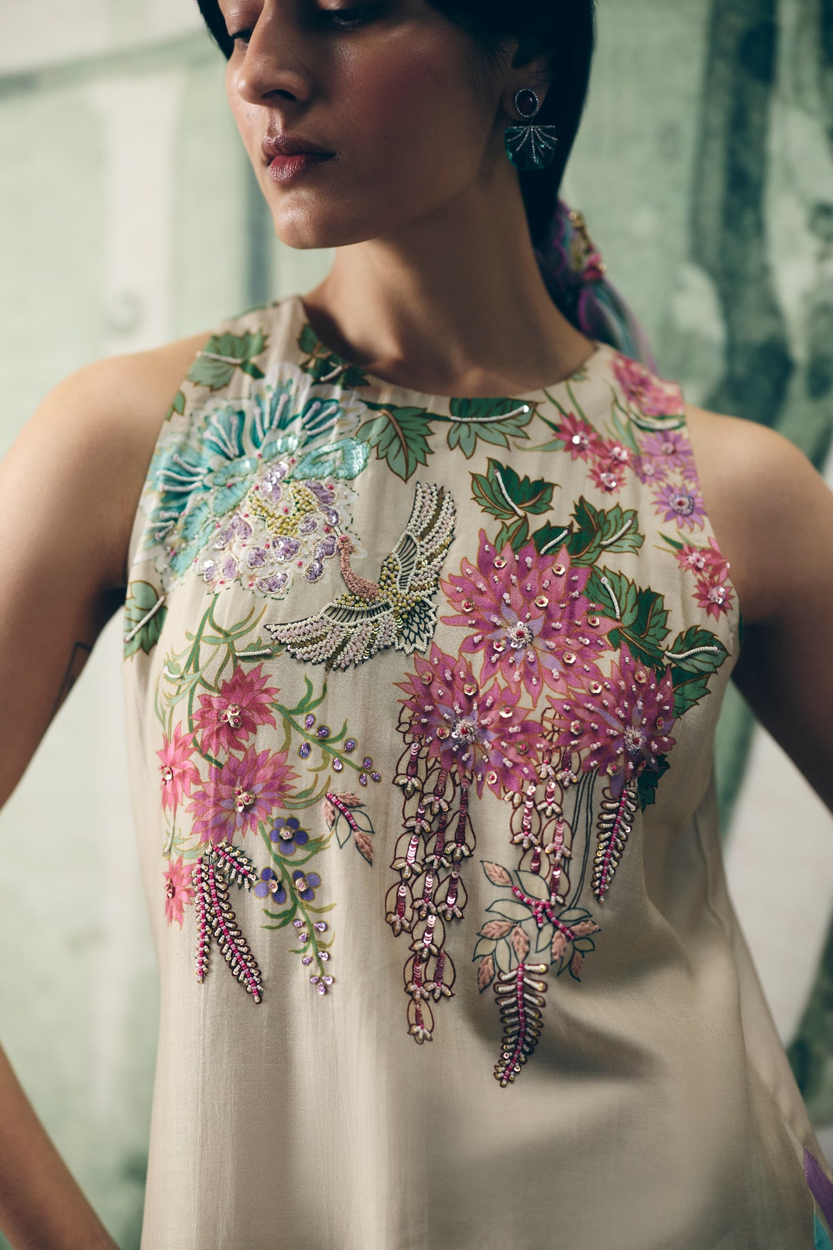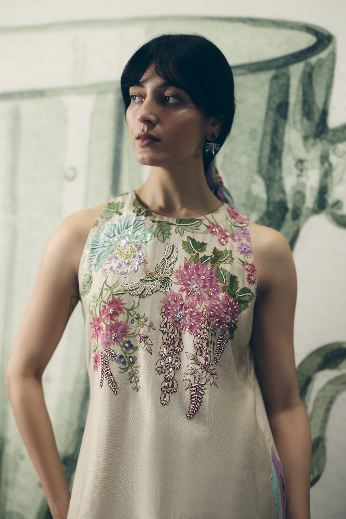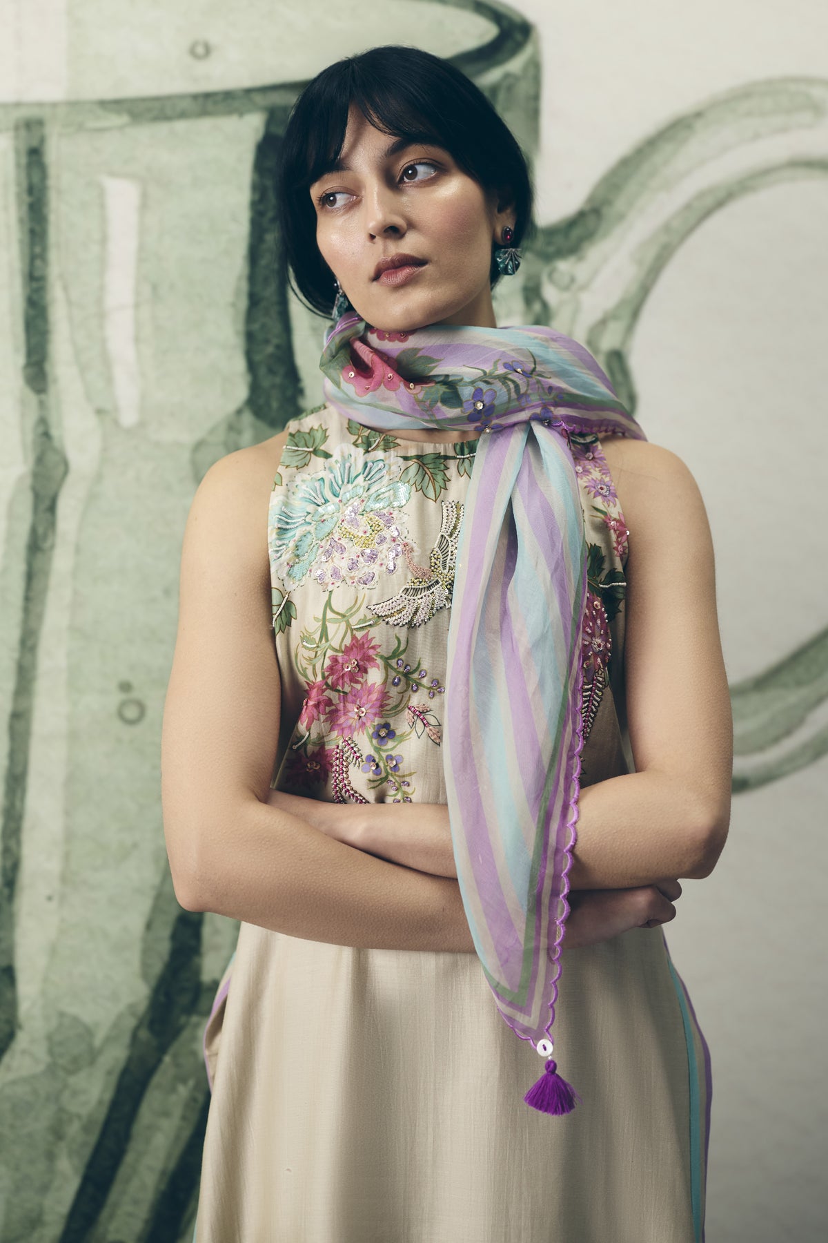 An ivory kurta with a floral printed and embroidered yoke, is paired with pants with striped side patches. It is paired with a printed and embroidered scarf which adds a subtle contemporary edge.