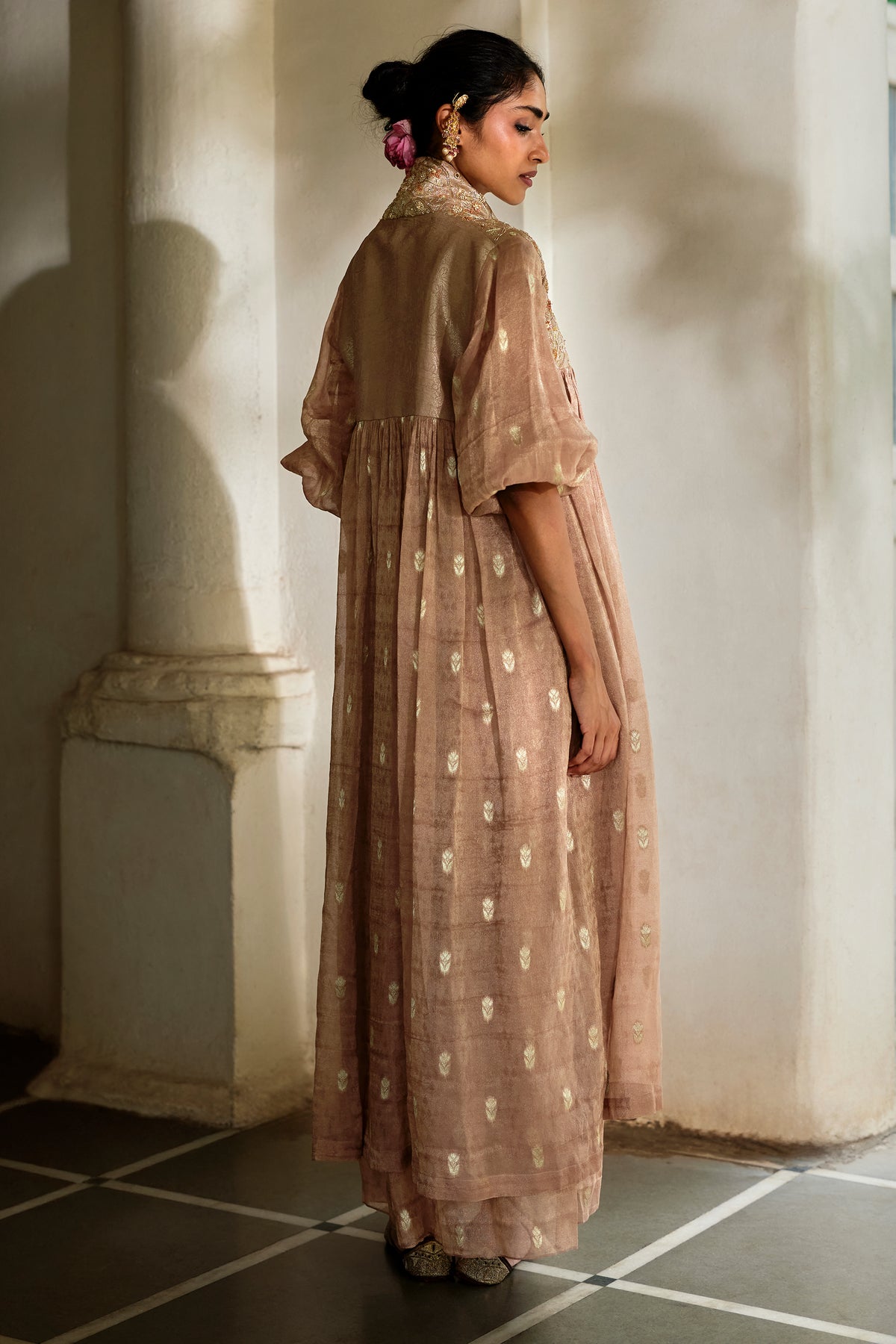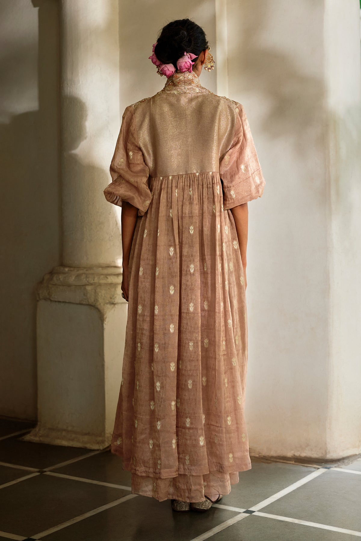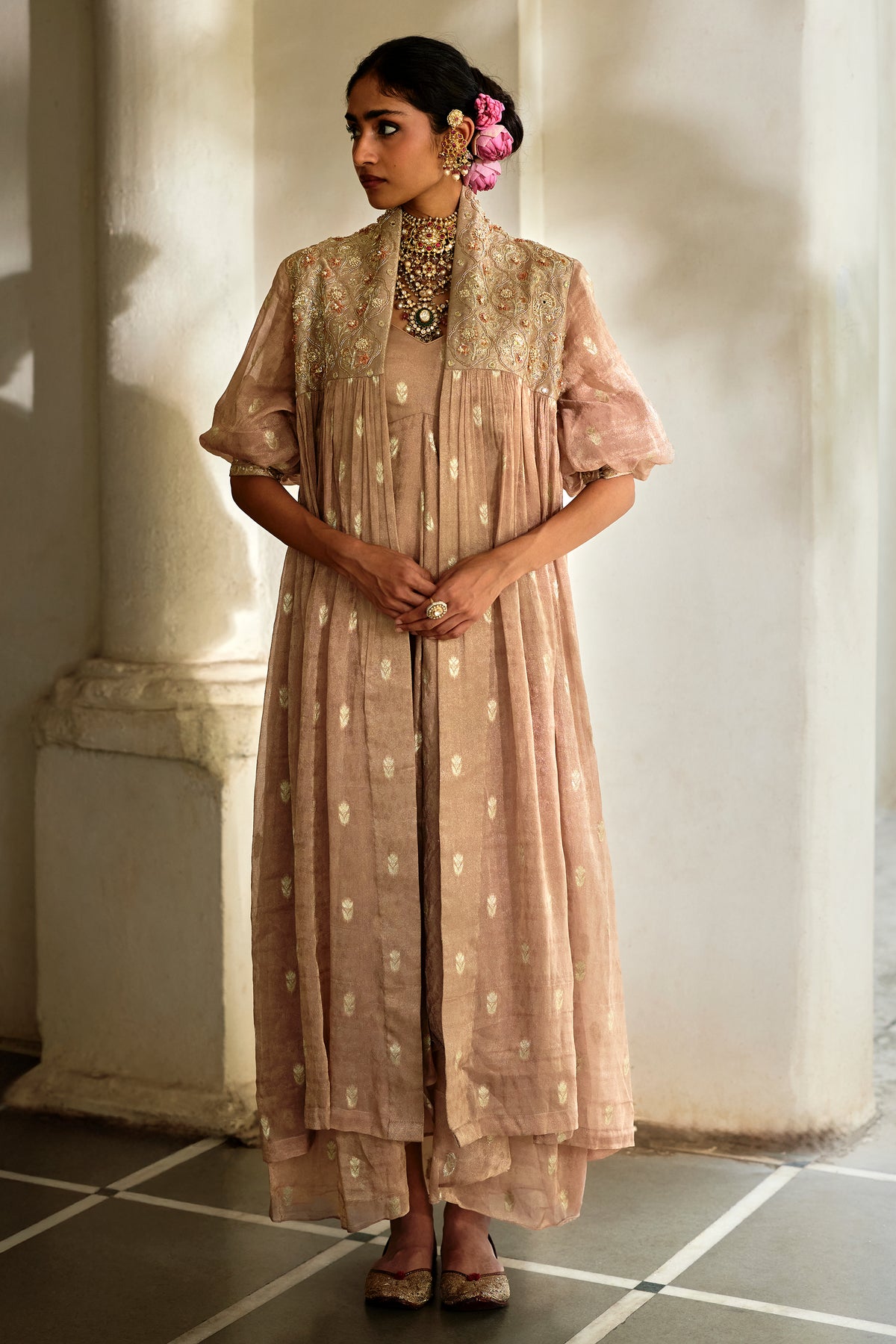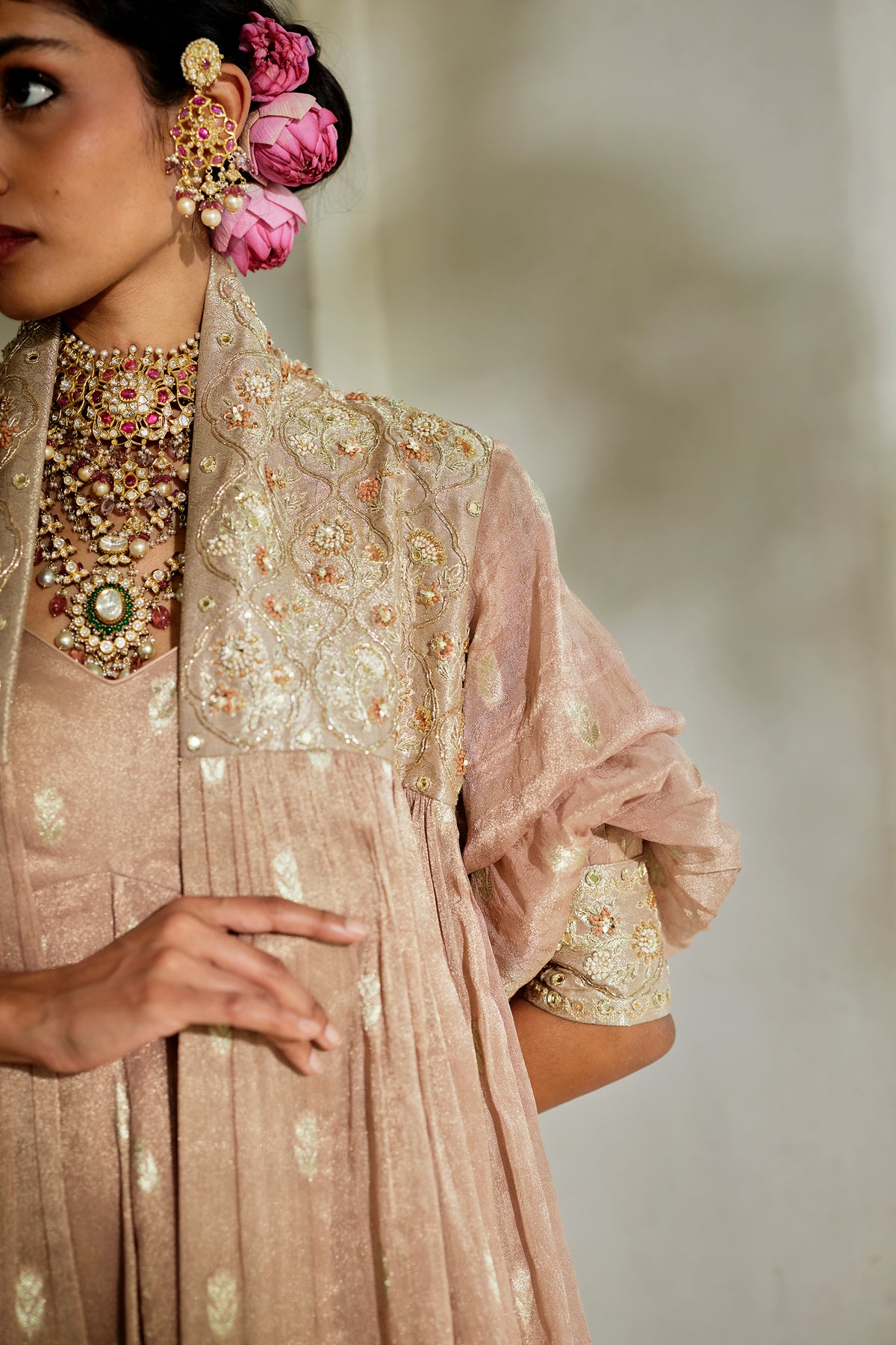 A tissue dress adorned with woven butis and featuring a graceful drape detail, paired with a tissue jacket enhanced with a jamavar embroidered yoke and cuffs. Perfect for festive gatherings, parties, and sophisticated soirées, this ensemble beautifully blends delicate craftsmanship with contemporary luxury.