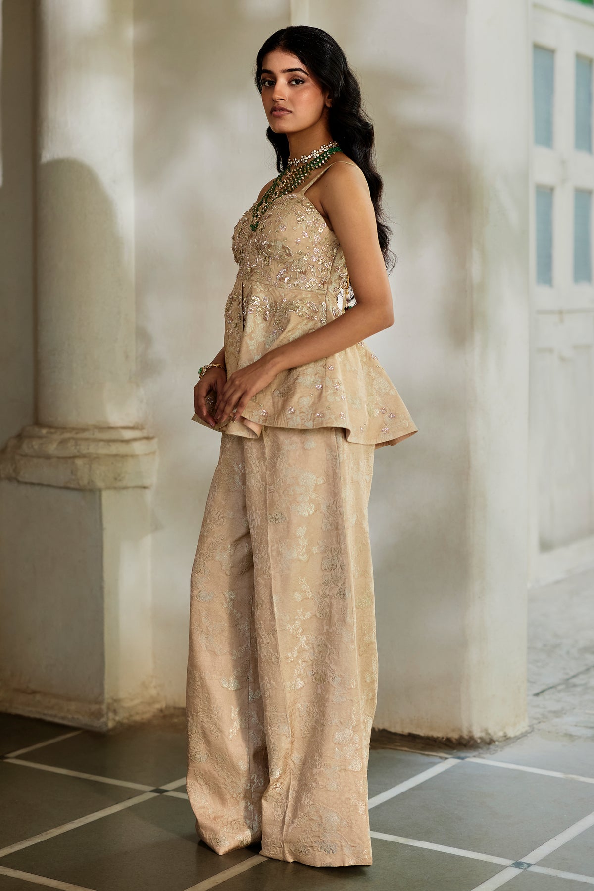 A graceful statement outfit in a jacquard, a peplum adorned with intricate hand embroidery paired with pants , perfect for festive gatherings and upscale celebrations.