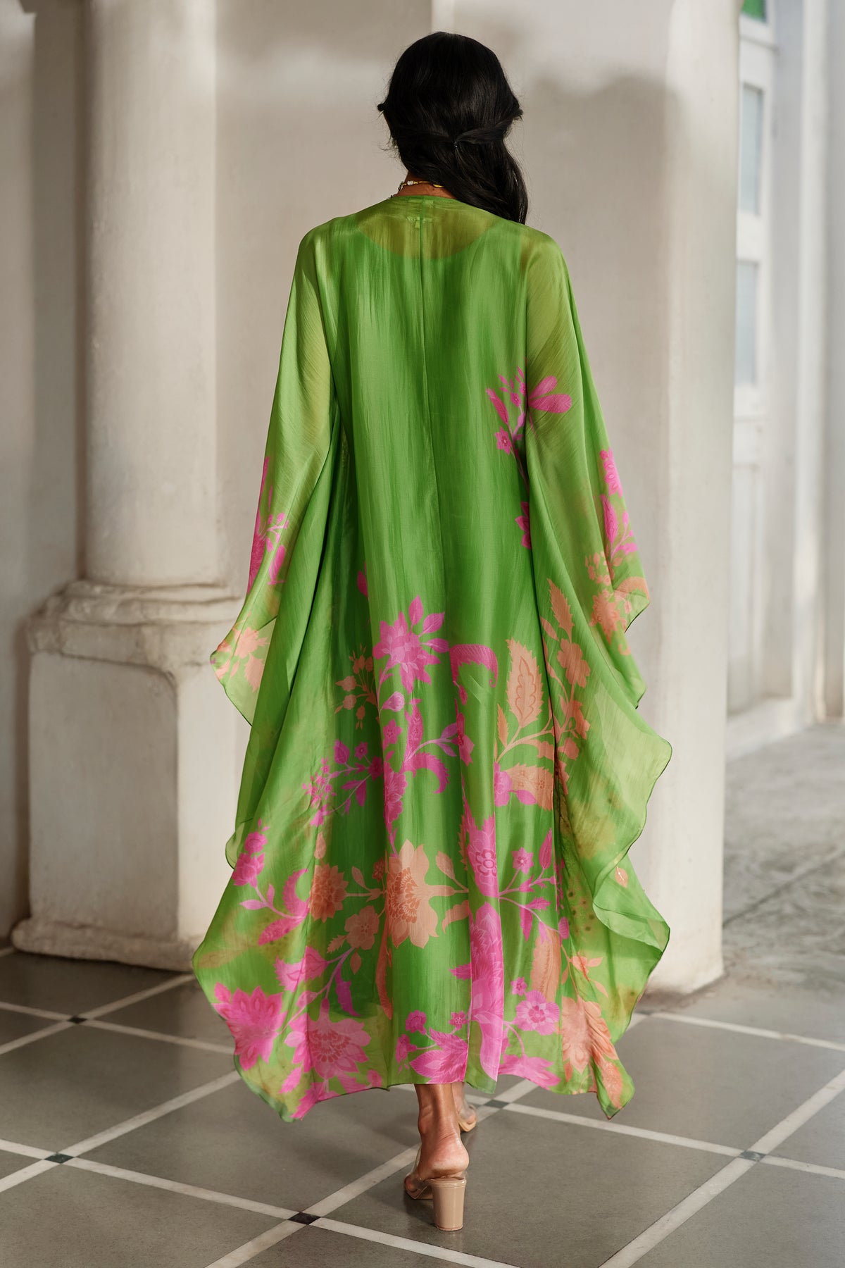 A breezy green floral printed kaftan adorned with delicate all-over embroidery for an effortless yet luxurious appeal. The heavily embroidered neckline adds a bold artisanal touch, while hand-tucked tassels bring movement and charm. Perfect for brunches, poolside parties, garden soirees, and casual festive gatherings.